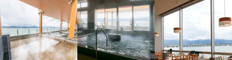 施設内には、温泉、岩盤浴、さらにはリラクゼーションやレストランなど、様々な施設を有しています。特に、3階の温浴施設は、近江八景のひとつである「比良の簿雪」、眼下には琵琶湖の絶景を楽しめる露天風呂と、関西最大級の広さを誇る大炭酸泉が魅力です。